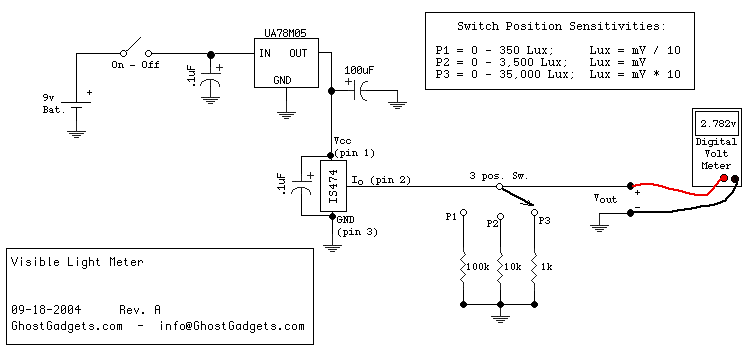 This is a simple visible light meter that is very easy to build, as well as inexpensive (around $5 for parts from DigiKey). The IS474 is a visible light sensor that has the very useful feature of passing .1 uA per lux, which can easily be converted to a measurable voltage using standard value resistors. There is a three position switch in this schematic, which allows you to choose the measurement level for better resolution, with a maximum reading of 35,000 lux. Then, the voltage across that resistor is simply measured with a digital volt meter - inexpensive ones are available at Wal-Mart or Radio Shack for under $20. The voltage output is 0 - 3.50 volts, in which the conversion to lux varies depending on which position the sensitivity switch is set on. Also note that this voltage could also be read on an Analog to Digital Converter, but it would be necessary to buffer the output impedance with a voltage follower after the + terminal of Vout. The IS474 can be mounted in many ways - as long the light "window" is exposed to whatever light source you want to measure. The power supply can be from a power transformer, 9 volt battery, or any other 7-25 volt source.