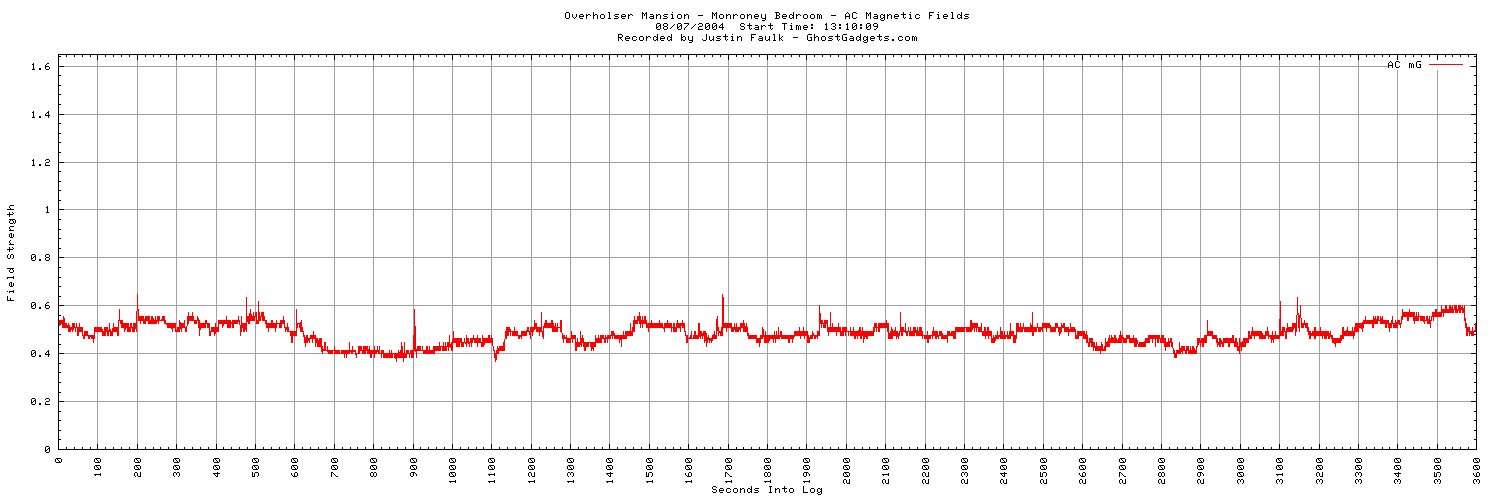 This was a follow up log for the large (10.5 mT) spike recorded on a TriField Natural meter during the second investigation, and also a control log for comparison to previous control runs in other areas (since little anomalous activity has been reported from this area). Measuring equipment was set up on the same table as the previous recorded fluctuation. Static magnetic fields showed minor fluctuations, mainly in the N-S axis, while AC magnetic fields show two large, nearly instantaneous spikes in field strength. The first spike, around the 1,835 second mark, jumps from .5 to .9 mG, and back down to about .6 mG. The second spike (3,595 second mark) was very similar to the first, peaking at 1 mG, both occurring within a 3 second time period. This could be due to nearby unseen electric appliances, such as an air conditioner, or other appliances that switch on and off sporadically. The spike field strength is very small (1 mG), but the quickness of the field change could trigger odd experiences. All EM fields showed less/equal variance (SD) when compared to previous typical control runs.