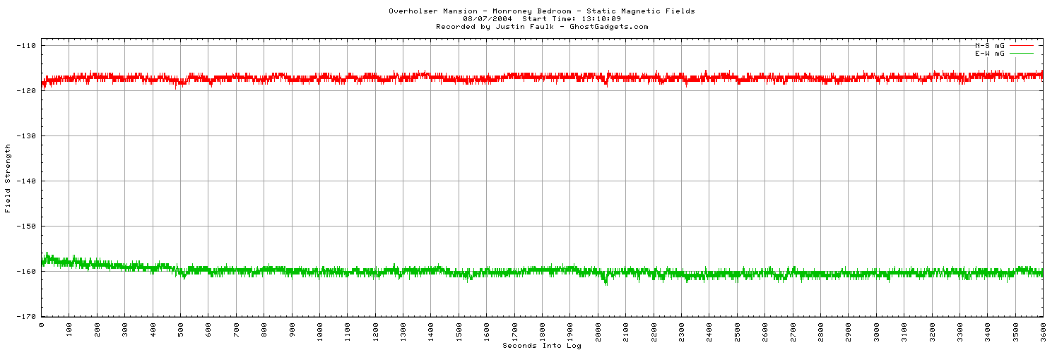 Docent A reported feelings of uneasiness in this room, particularly in one spot, near the bathroom. To get an idea of what kind of fields would effect the brain in this area, measuring equipment was setup 5 feet off the ground (this was the highest pedestal we could rig on-site without planning) at the same location where uneasy feelings were experienced. Immediately upon entering the area, I noted the smell of natural gas, which was then confirmed by Docent A, who said that the smell has been there for quite some time. It is unknown whether there could possibly be an old gas furnace in the area, but currently the mansion uses all electric appliances. This gas presence could be causing the feelings of uneasiness, as reported by Utilities Kingston gas/electric company, carbon monoxide in natural gas can "cause flu-like symptoms without a fever, including: headaches, nausea, dizziness, drowsiness or fatigue, burning eyes, confusion and loss of coordination". AC magnetic fields in this area shown minor fluctuations in the baseline, and just a few notable spike of about .15 mG above the baseline. Static magnetic fields showed some minor temporal changes of about 3 mG, with little oscillation compared to the graphs of other areas. At the beginning of the log, the N-S static magnetic field baseline shifted down about 2 mG, which could be due to the storm geomagnetic activity at the time. EM variance in static magnetic fields showed to be a higher than typical control runs, particularly in the E-W axis.