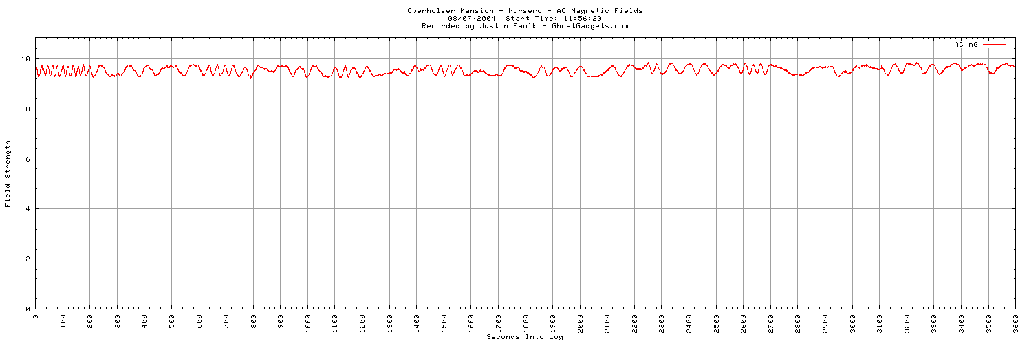 Three investigations of the Overholser Mansion had been held preciously by OPRA (Oklahoma Paranormal Research Alliance), which I attended two of, both with the Arcadia computer monitoring system. The first investigation (April, 2003) yielded mixed data, and little environmental correlation on Arcadia, but the second investigation (August, 2003) yielded some very interesting data. Variances seemed to be high in the static magnetic fields (1st floor), and a TriField Natural meter (on magnetic), set up in the Library, showed a large (10.5 mT) temporal field change. Reports of being touched were also noted by several team members, as well as a door on the 3rd floor opening by itself. I suspect to possibly find heavy local EM variances in the areas of interest (where uneasiness, anticipation, fear, and possibly RSPK activity has been reported), as well as possible infrasonic sound resonant frequencies, which can cause feelings of uneasiness and possibly fear. EM data (AC and static magnetic) will be logged continuously in several areas of interest, while electric fields and sound resonance data is being calculated for other areas in the mansion.