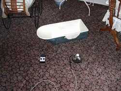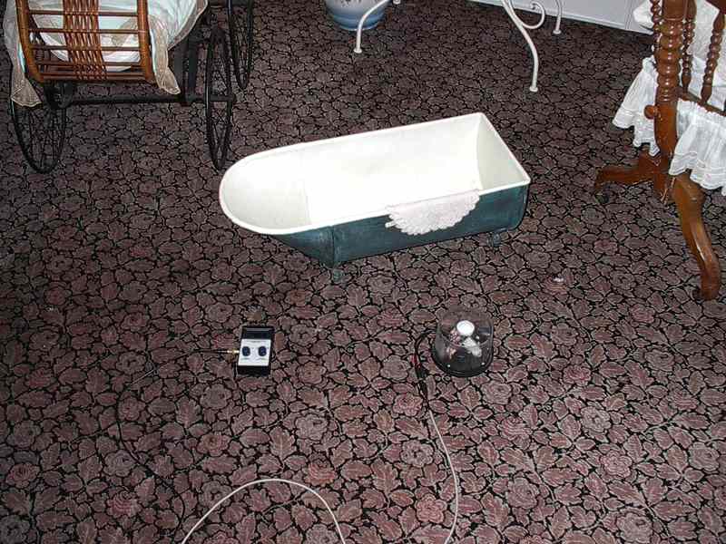 Reports from Docent A point to possible RSPK type movement of the miniature tub shown in the photo. To get an idea of the EM fields in the area of the bathtub, measuring equipment was set up on the ground adjacent to it. Very strong (9.6 mG) AC baseline magnetic fields were found, most likely due to 60 hz mains wiring under the floor in this area. These fields fluctuated between 9.2 and 9.8 mG at various frequencies, from .017 to .05 hertz. Static magnetic fields in the N-S axis showed a similar oscillation (.017 to .026 hertz), but each frequency is short lived, not lasting more than a few minutes. The odd frequency oscillation and high peak-to-peak strength (~5 mG) in the N-S axis is something that I've never seen before, and could possibly be due to aliasing, caused by the large field strength of 60 hertz magnetic fields (10 mG). Static magnetic fields in the E-W axis show a similar oscillation, but not as high peak-to-peak strength (< 3 mG). The very strong AC magnetic field (9.6 mG) is much higher than the recommended exposure level for most countries, which is typically 2-3 mG at 60 hertz. EM variance in this area showed to be a MUCH higher than typical control runs, particularly in N-S static magnetic fields.