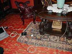 Docent A reports feelings of uneasiness in this room, adjacent to the ballroom, currently being used as storage. Measuring equipment was set up in the center of the room, approximately 5 feet off the ground. Static magnetic fields show instability on both axis, along with small, smooth variances. Frequencies between .01 and .02 hertz are apparent, but these oscillations are short lived, not seeming to last more than a few minutes for each. AC magnetic fields show similar spikes as the Library area had, suggesting that the house may have poor shielding and grounding. These spikes were much larger, the first occurring at 80 second mark, up to 1.45 mG, which then drops back down to about .79 mG. This new baseline holds for about 10 minutes, when the field strength then drops to about .6 mG. Another large spike up to 1.45 mG at the 1,460 second mark starts a baseline of .76 mG. After another 10 minutes, the field strength drops again to .6 mG, which holds until a spike of 1.6 mG occurs (2,840 second mark), and a .8 mG baseline is established. Just before the graph ended, the baseline dropped to just above .7 mG. The process seemed to follow a pattern, each spike occurring exactly 23 minutes apart, the cause of which is unknown (as mentioned above, possibly an air conditioner or other appliance). Electric fields were much higher than normal in this area, in some places over 200 V/m, which can cause odd feelings such as tingling, goosebumps, etc.. EM variance in this area showed to be a little higher than typical control runs.