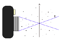Diagram 1, on the left, is a representation of how dust in front of the camera lens appears orb-like when a flash is used. "B" represents how light travels through the camera lens, and "A" represents the focal point of the lens, or the point objects need to be past in order to be in focus. As you can see, there are dust particles closer to the lens than point A, therefore the dust will appear out-of-focus, as seen in Diagram 2. When the flash fires (Diagram 1), light is reflected off the dust, back into the camera lens, causing the dust to be illuminated. Because of the angle of the flash and the camera lens, the closer the flash is to the lens, the more prone it will be to dust orbs. The same applies for using nightshot video cameras, the IR light reflects off the out-of-focus dust, causing them to look like "orbs" or plasmoids.