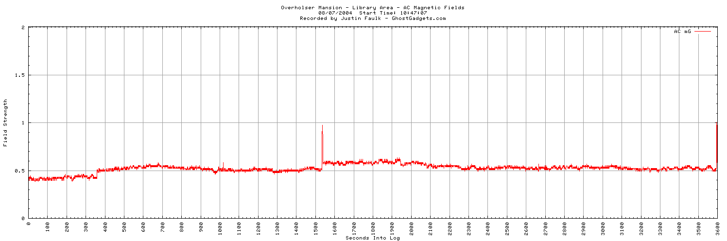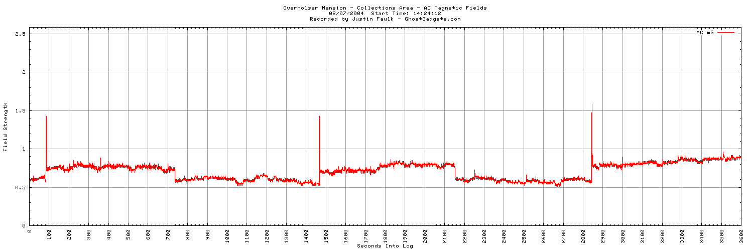 Docent A reports feelings of uneasiness in this room, adjacent to the ballroom, currently being used as storage. Measuring equipment was set up in the center of the room, approximately 5 feet off the ground. Static magnetic fields show instability on both axis, along with small, smooth variances. Frequencies between .01 and .02 hertz are apparent, but these oscillations are short lived, not seeming to last more than a few minutes for each. AC magnetic fields show similar spikes as the Library area had, suggesting that the house may have poor shielding and grounding. These spikes were much larger, the first occurring at 80 second mark, up to 1.45 mG, which then drops back down to about .79 mG. This new baseline holds for about 10 minutes, when the field strength then drops to about .6 mG. Another large spike up to 1.45 mG at the 1,460 second mark starts a baseline of .76 mG. After another 10 minutes, the field strength drops again to .6 mG, which holds until a spike of 1.6 mG occurs (2,840 second mark), and a .8 mG baseline is established. Just before the graph ended, the baseline dropped to just above .7 mG. The process seemed to follow a pattern, each spike occurring exactly 23 minutes apart, the cause of which is unknown (as mentioned above, possibly an air conditioner or other appliance). Electric fields were much higher than normal in this area, in some places over 200 V/m, which can cause odd feelings such as tingling, goosebumps, etc.. EM variance in this area showed to be a little higher than typical control runs.