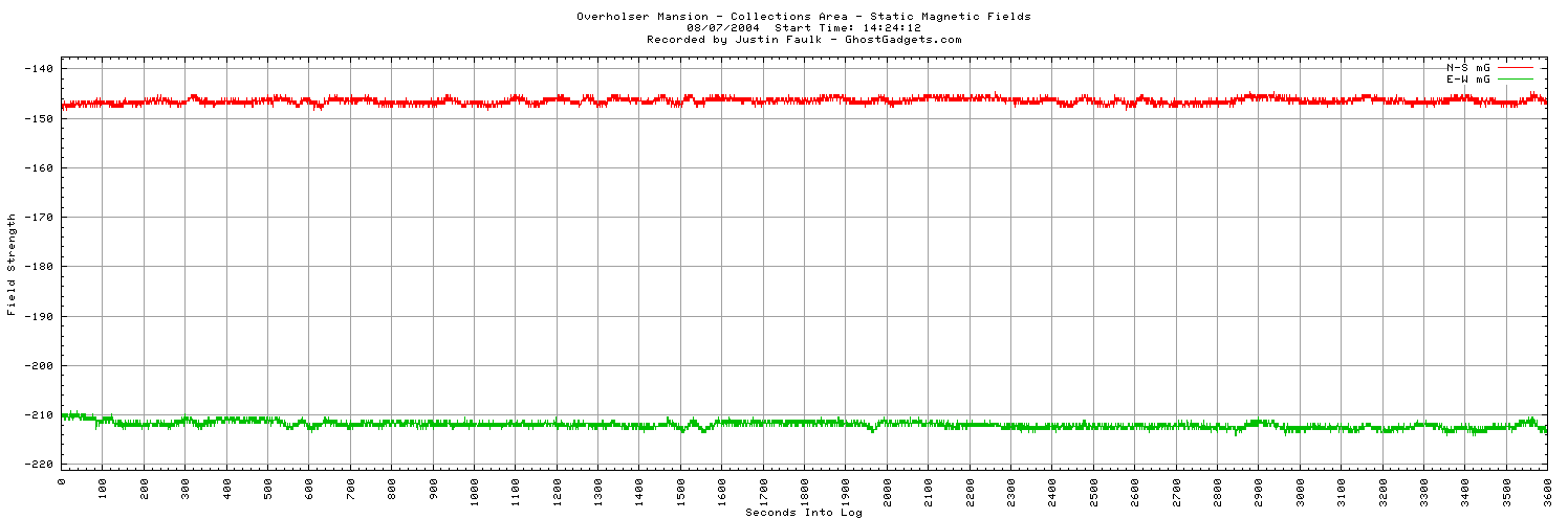 Docent A reported feelings of uneasiness in this room, particularly in one spot, near the bathroom. To get an idea of what kind of fields would effect the brain in this area, measuring equipment was setup 5 feet off the ground (this was the highest pedestal we could rig on-site without planning) at the same location where uneasy feelings were experienced. Immediately upon entering the area, I noted the smell of natural gas, which was then confirmed by Docent A, who said that the smell has been there for quite some time. It is unknown whether there could possibly be an old gas furnace in the area, but currently the mansion uses all electric appliances. This gas presence could be causing the feelings of uneasiness, as reported by Utilities Kingston gas/electric company, carbon monoxide in natural gas can "cause flu-like symptoms without a fever, including: headaches, nausea, dizziness, drowsiness or fatigue, burning eyes, confusion and loss of coordination". AC magnetic fields in this area shown minor fluctuations in the baseline, and just a few notable spike of about .15 mG above the baseline. Static magnetic fields showed some minor temporal changes of about 3 mG, with little oscillation compared to the graphs of other areas. At the beginning of the log, the N-S static magnetic field baseline shifted down about 2 mG, which could be due to the storm geomagnetic activity at the time. EM variance in static magnetic fields showed to be a higher than typical control runs, particularly in the E-W axis.