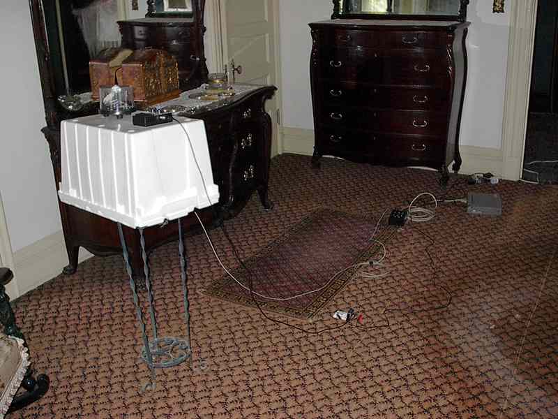 Reports from Docent A point to possible RSPK type movement of the miniature tub shown in the photo. To get an idea of the EM fields in the area of the bathtub, measuring equipment was set up on the ground adjacent to it. Very strong (9.6 mG) AC baseline magnetic fields were found, most likely due to 60 hz mains wiring under the floor in this area. These fields fluctuated between 9.2 and 9.8 mG at various frequencies, from .017 to .05 hertz. Static magnetic fields in the N-S axis showed a similar oscillation (.017 to .026 hertz), but each frequency is short lived, not lasting more than a few minutes. The odd frequency oscillation and high peak-to-peak strength (~5 mG) in the N-S axis is something that I've never seen before, and could possibly be due to aliasing, caused by the large field strength of 60 hertz magnetic fields (10 mG). Static magnetic fields in the E-W axis show a similar oscillation, but not as high peak-to-peak strength (< 3 mG). The very strong AC magnetic field (9.6 mG) is much higher than the recommended exposure level for most countries, which is typically 2-3 mG at 60 hertz. EM variance in this area showed to be a MUCH higher than typical control runs, particularly in N-S static magnetic fields.